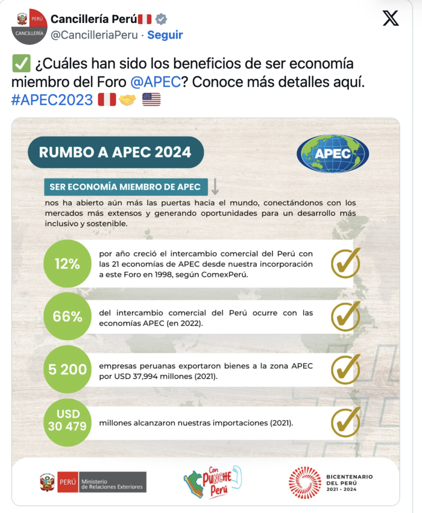 La Cancillería destacó que ser economía miembro de APEC nos ha abierto aún más las puertas hacia el mundo, conectándonos con los mercados más extensos y generando oportunidades para un desarrollo más inclusivo y sostenible.