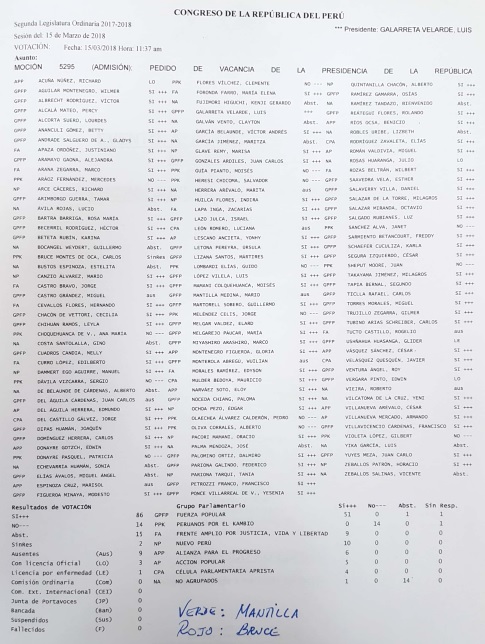 – 11.35 a.m. Con 87 votos a favor, 15 en contra y 15 abstenciones, el Pleno del Congreso aprobó en mayoría la admisión de la moción del pedido de vacancia presidencial contra PPK.