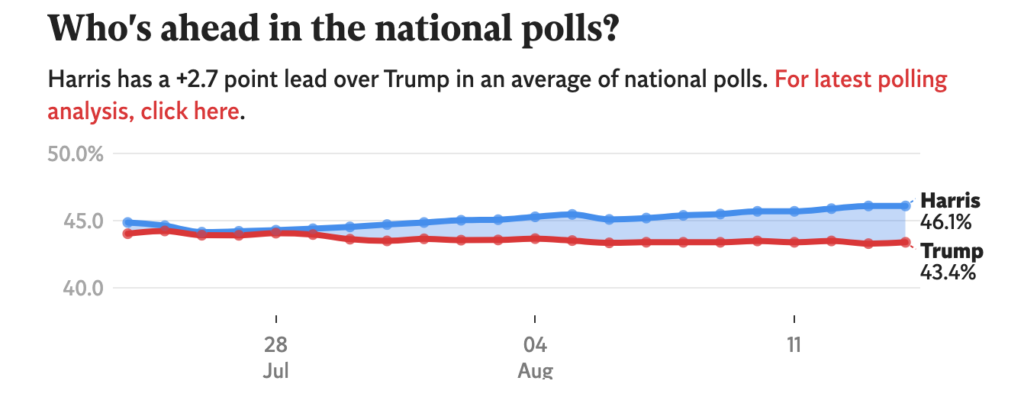 Harris tiene ahora una ventaja de 2,7 puntos sobre Trump en la última media de encuestas nacionales, cotejada como antes indicado por FiveThirtyEight.