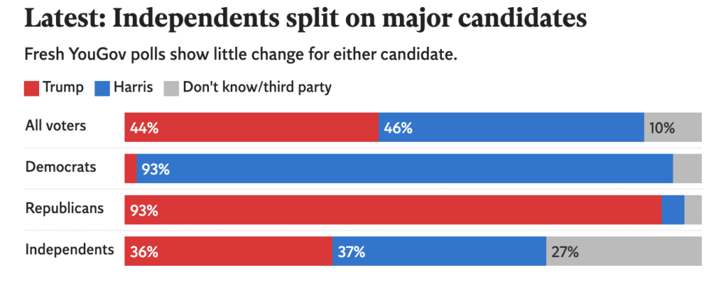 Los votantes independientes siguen muy divididos sobre los dos candidatos; un 36 % piensa votar por Harris y un 37 % por Trump.