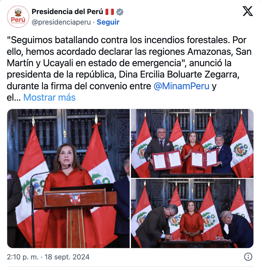 La presidenta Dina Boluarte, anunció la declaración de estado de emergencia en tres regiones del país debido a los incendios forestales, y aseguró que el gobierno ha atendido de manera inmediata a los focos de incendio desde el principio. Según Boluarte, la mayoría de los incendios fueron causados por la acción humana, principalmente por prácticas agrícolas tradicionales.