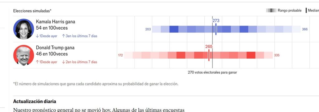 El muy prestigioso medio » The Economist » por ejemplo, publica hoy sus guarismos especializados por medio del cual indica la proyección arrojaría un triunfo de Kamala Harris el próximo 5 de Noviembre del 2024, Martes, por un contundente 54% sobre 46% de Donald Trump.