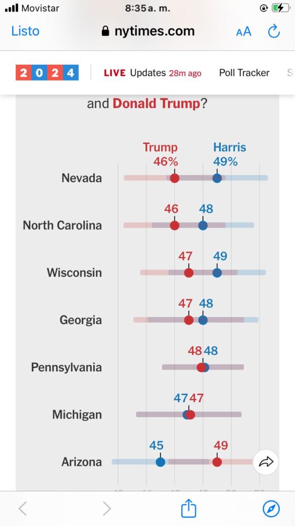 En correspondencia con este análisis, el igualmente muy calificado medio THE NEW YORK TIMES, el día de hoy asimismo publicó hacia las 8.30 de la mañana los resultados últimos de la muy prestigiosa encuestradora SIENA. Que dan el triunfo de Kamala Harris en 5 de 7 Estados denominados los Swing States.