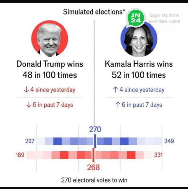 El muy prestigioso THE ECONOMIST, predice hoy un triunfo de Kamala Harris, por 4 puntos para este Martes en las Presidenciales USA. Al respecto, publicaron el siguiente cuadro :