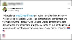 El presidente de Paraguay, Santiago Peña, comentó en X: “Felicitaciones, Donald Trump, por ser elegido como el nuevo presidente de los Estados Unidos. ¡La democracia ha demostrado nuevamente su fortaleza! Paraguay y los Estados Unidos comparten valores democráticos firmemente arraigados, y confío en que seguiremos fortaleciendo nuestra cooperación para el beneficio de ambas naciones”.