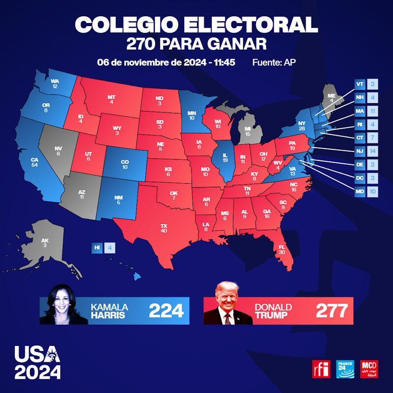 Las votaciones del 5 de noviembre resultaron en una contundente victoria para los republicanos: su candidato, Donald Trump, obtuvo 277 votos electorales, superando los 270 requeridos. Además, los estados péndulo que aún están por definirse muestran una clara inclinación hacia el color rojo.