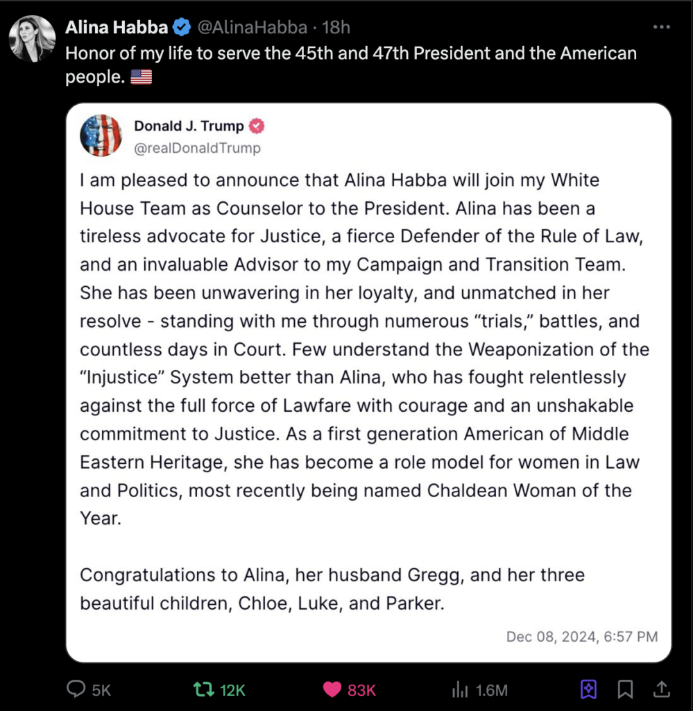 ALINA HABBA ASUME NUEVO ROL EN ADMINISTRACIÓN TRUMP..!!!
