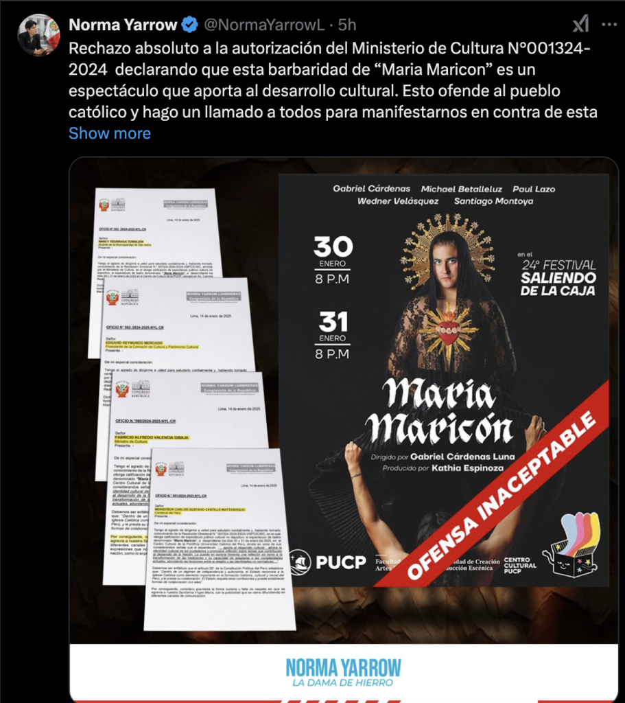 Tambien la congresista Norma Yarrow Rechazo absolutamente la autorización del Ministerio de Cultura N°001324-2024 declarando que esta barbaridad de “Maria Maricon” es un espectáculo que aporta al desarrollo cultural. Esto ofende al pueblo católico y hago un llamado a todos para manifestarnos en contra de esta presentación. Nos reuniremos en PROTESTA el día de tan execrable hecho.