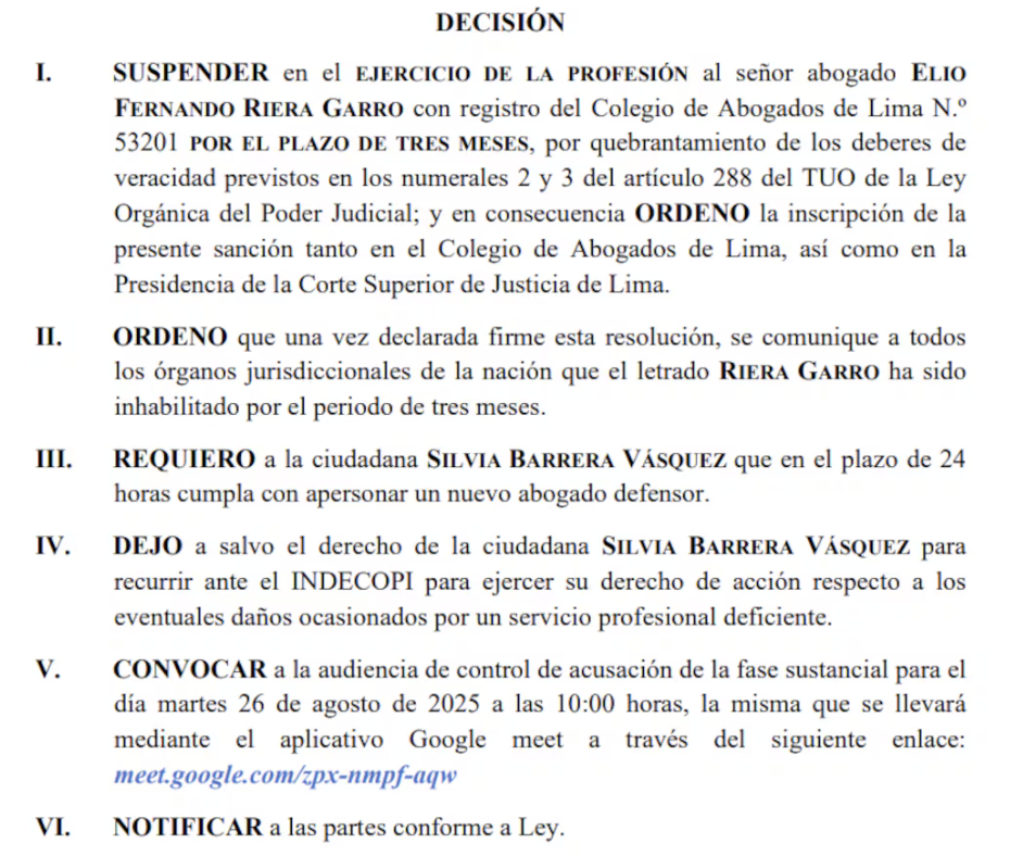 El letrado Riera Garro ha señalado aseveraciones erradas y falsas que se tienen y deben corregir en favor de la sociedad, de su patrocinada y de la profesión”, indica la resolución, que lleva la firma del juez Walther Huayllani Choquepuma.