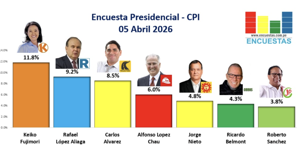 Detrás de ella, Carlos Álvarez (País Para Todos) se ubica en segundo lugar con alrededor del 8-9%, aunque en caída. Rafael López Aliaga (Renovación Popular) cae a 7%, mientras Ricardo Belmont (Obras) sigue ganando terreno y ya toca el 6%. El resto de candidaturas se reparten migajas nadie supera el 5%. En el Senado, Fuerza Popular lidera, pero Renovación Popular, Juntos por el Perú, País Para Todos, Alianza para el Progreso y Obras empatan en el 5%.